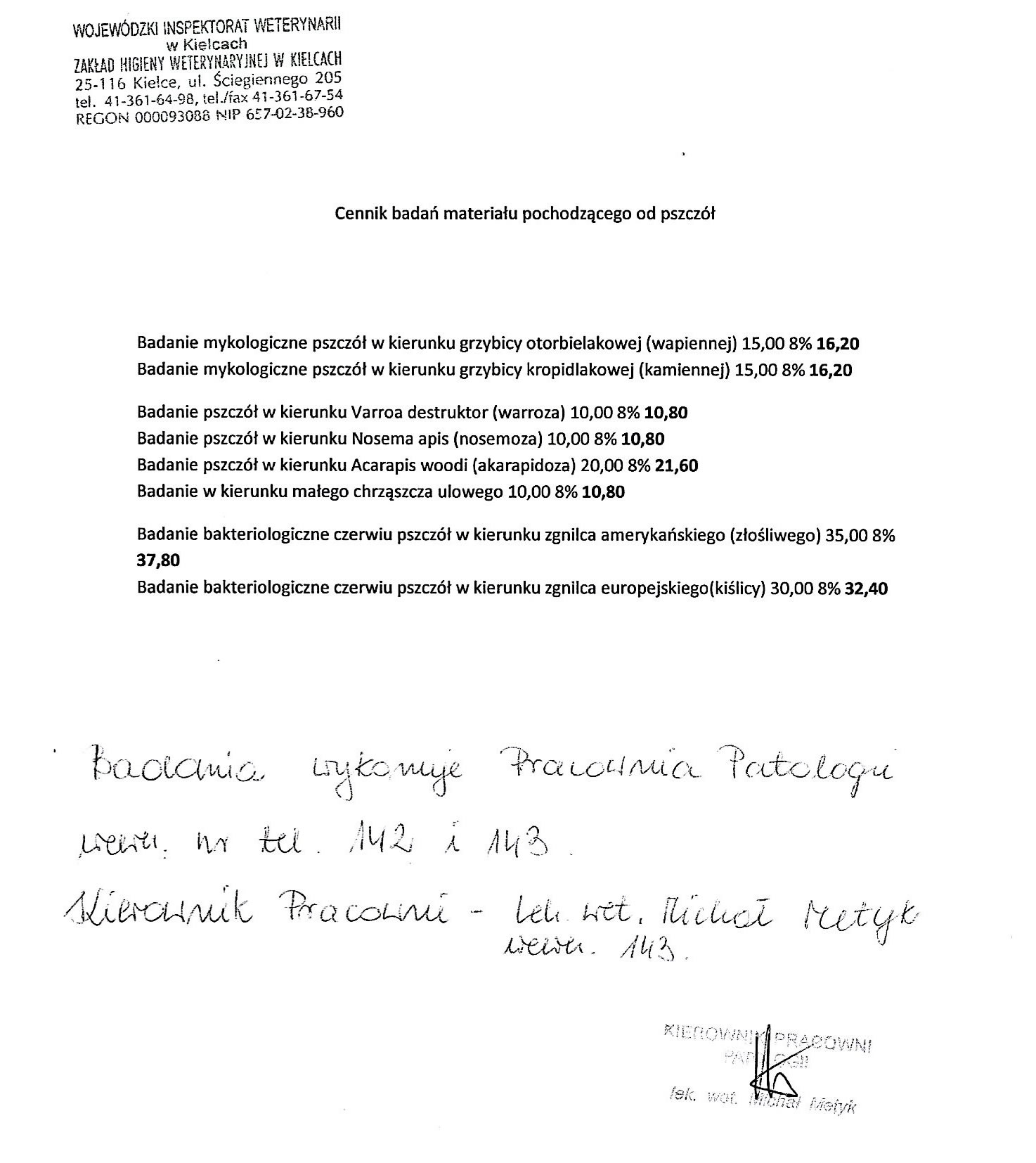 Cennik badań materiału pochodzącego od pszczół...